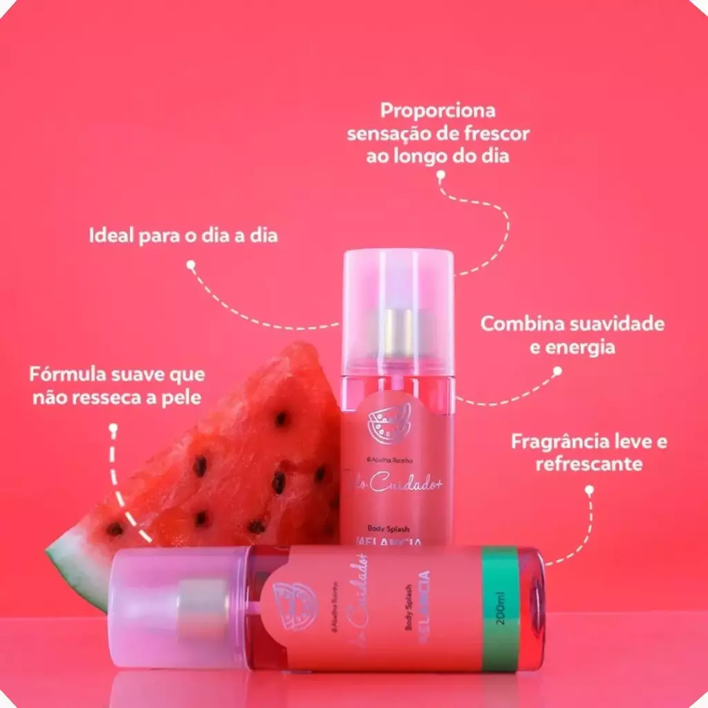 Enriquecido com ingredientes que hidratam e cuidam da pele, o Body Splash Melancia deixa uma sensação suave e refrescante, além de um perfume delicado que vai conquistar todos ao seu redor. Seu frasco de 200ml é prático e perfeito para levar na bolsa, garantindo que você tenha sempre à mão um toque especial de frescor.
